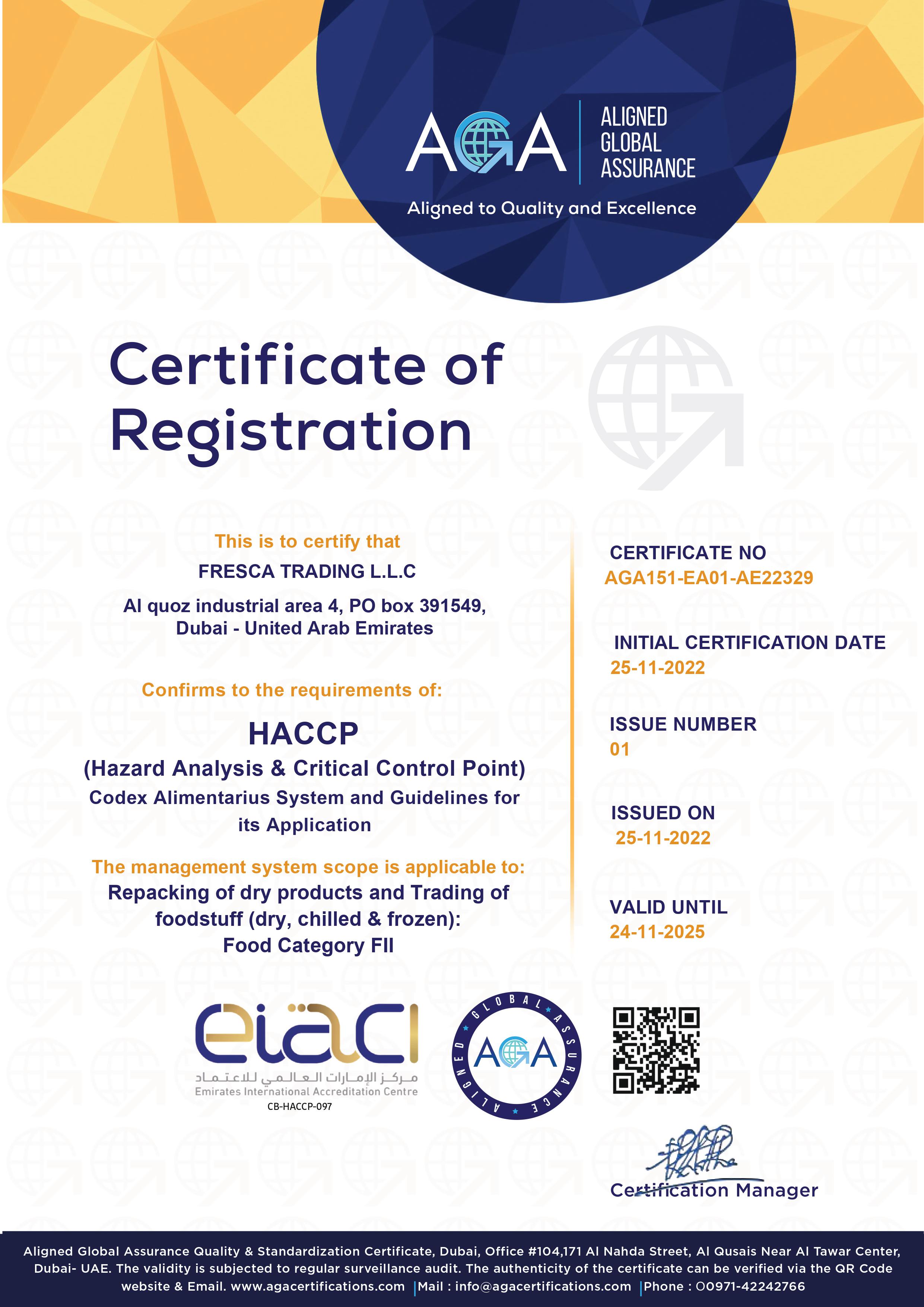 We are foodstuff importer and distributor based in Dubai. Our objective is to provide right products at right price by sourcing through complex network of suppliers. Our key performance indicator is On-time delivery to make competitive edge in market. Fresca targets to be preferred suppliers of dry & frozen foodstuff carrying approx 1000 different items. We are HACCP certified and keep strong customer service orientation to meet the needs of HORECA industry.